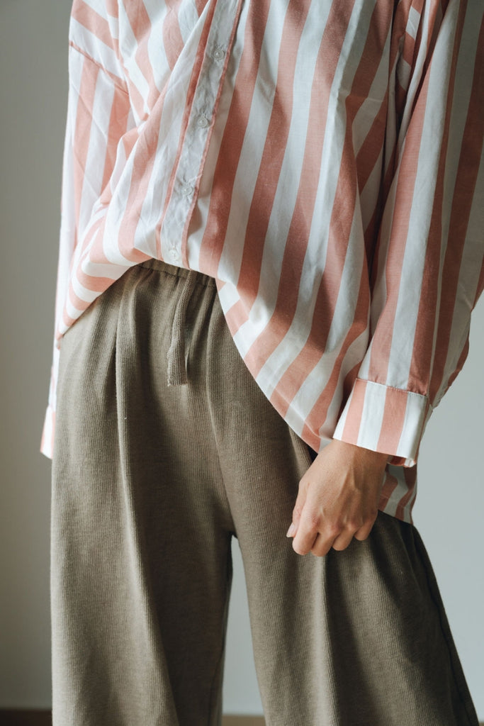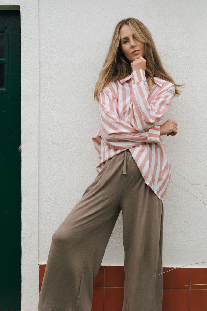 Flared pants with an elastic waistband, adjustable drawstring, and side pockets.
