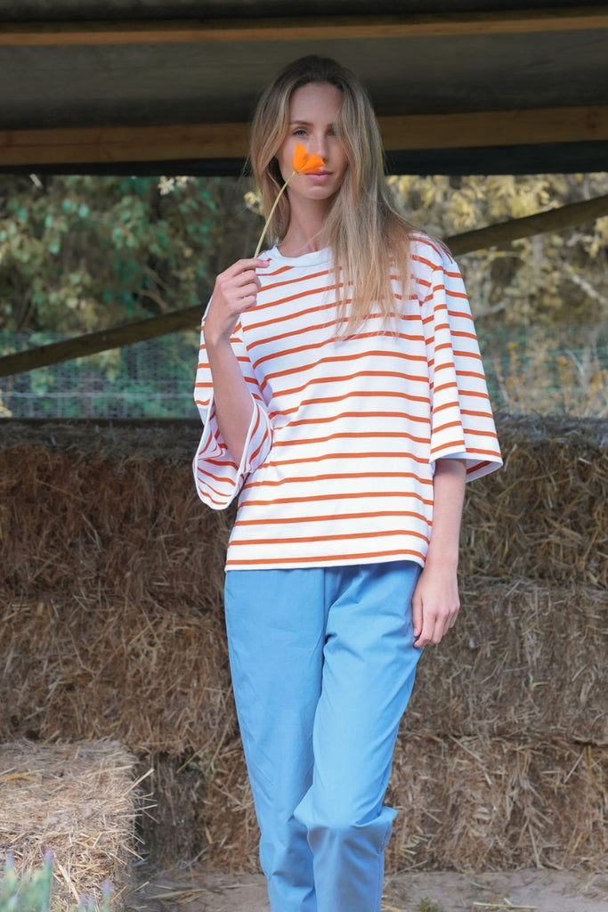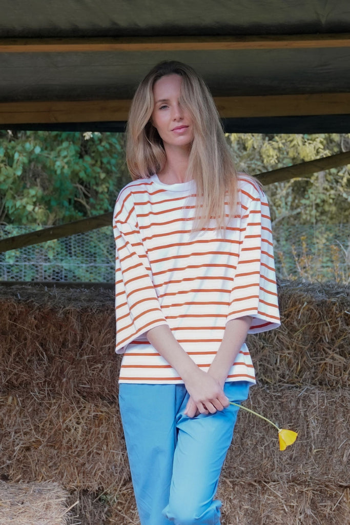 The shirt is made of 100% cotton and comes in the following colors: black and white stripes, blue and terracotta stripes, white and terracotta stripes.